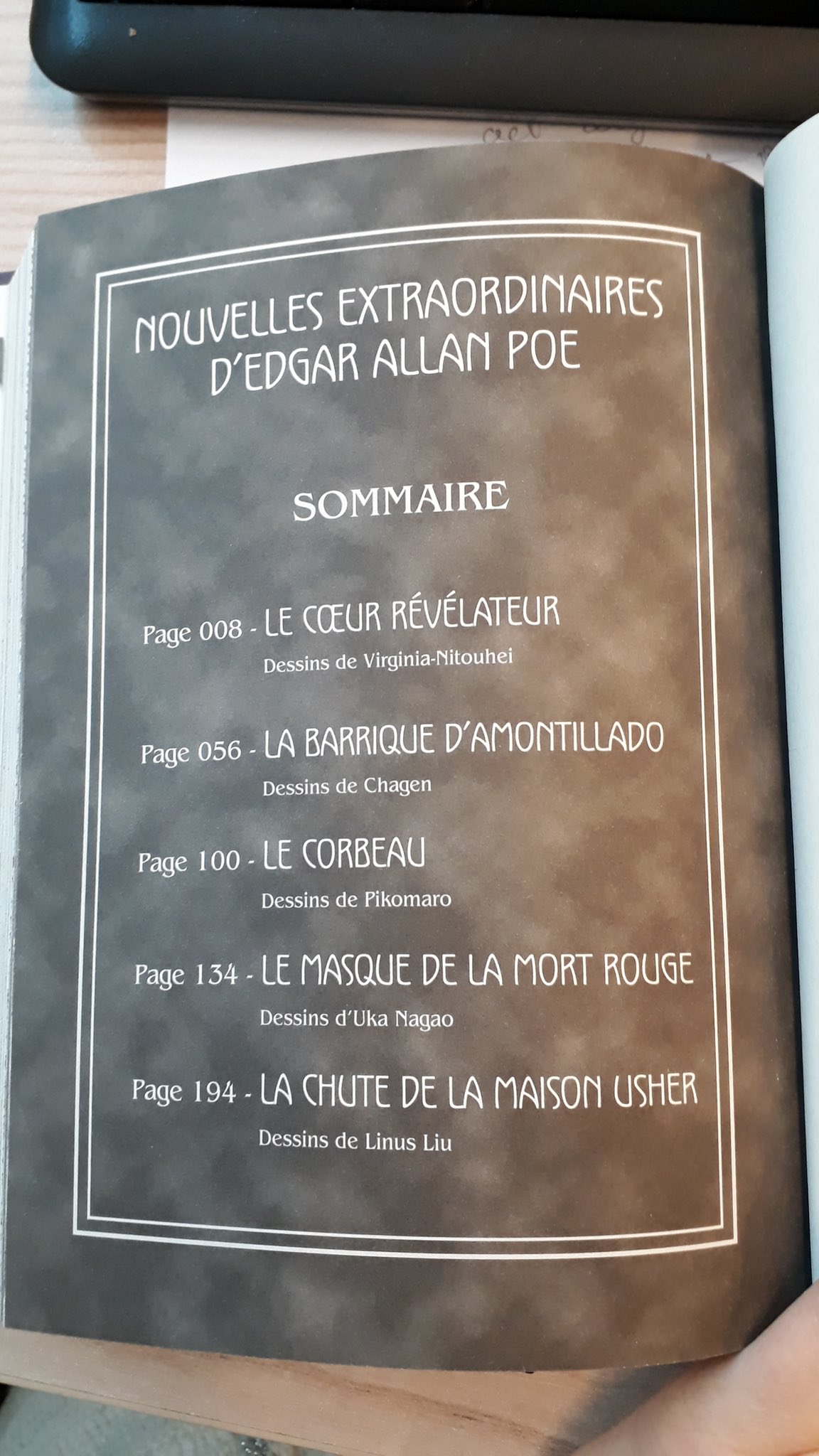 “Cet ouvrage rassemble cinq œuvres majeures d’Edgar Allan Poe : Le Corbeau est un poème narratif publié en 1845 ; les nouvelles Le cœur révélateur, La barrique d’Amontillado , Le Masque de la Mort rouge et La chute de la Maison Usher ont été publiées pour la première fois entre 1839 et 1846. Elles illustrent parfaitement les thèmes chers à cet auteur dans un univers bien particulier qui lui est propre : la peur des maladies et de la mort, le sentiment de culpabilité, l’obsession, l’amour ou encore la fatalité”.