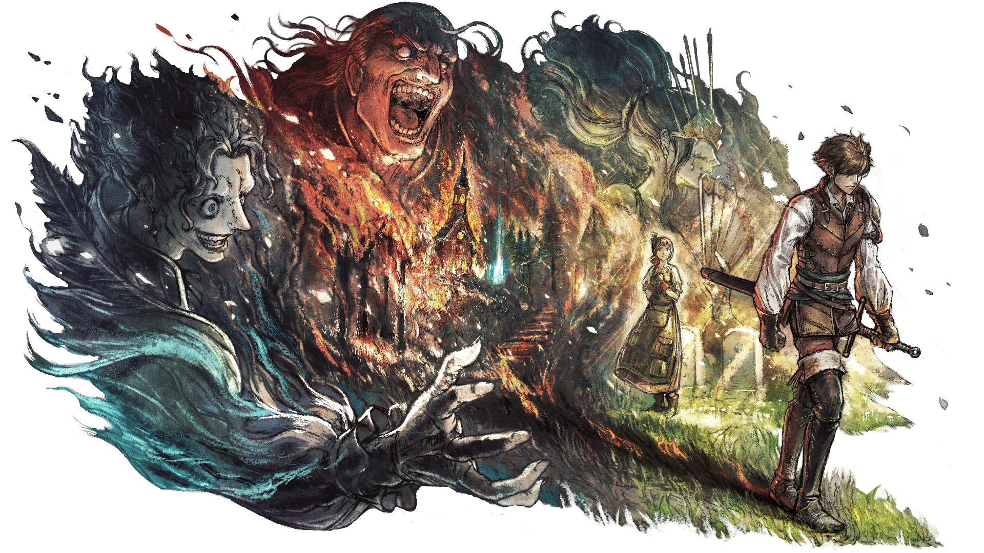 Ce trio organise l’attaque du village, les “ailes écarlates” – l’armée de Tytos – et mettent le village à feu et à sang. De nombreux villageois meurent et certains parviennent à s’enfuir, mais la cité est en ruine. Le protagoniste et Stia parviennent à s’échapper ensemble et sont pris sous l’aile d’un étrange érudit nommé Nomos. Quelques années plus tard, et après un entraînement où on choisit le premier job du protagoniste (ce choix est modifiable à partir d’un certain niveau et il est donc possible d’effectuer tous les jobs), le protagoniste et Stia décident chacun de se venger des auteurs du massacre et de reconstruire Wishvale, en retrouvant les villageois qui ont réussis à s’enfuir. C’est donc le premier chapitre de l’histoire, il faut abattre Herminia, la “Maîtresse de la Richesse”, Tytos, le “Maître du Pouvoir” et Auguste, le “Maître de la Renommée” (les traductions sont toujours faites par nos soins). Ces missions ne seront pas sans risque, de nombreux personnages qui aideront à parvenir à ces buts perdront la vie ! Mais une fois cela terminé, sachez que le jeu n’est absolument pas fini, d’autres antagonistes avec des desseins encore plus terribles croiseront votre route.