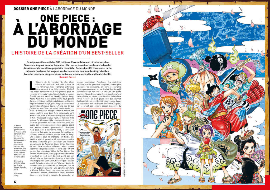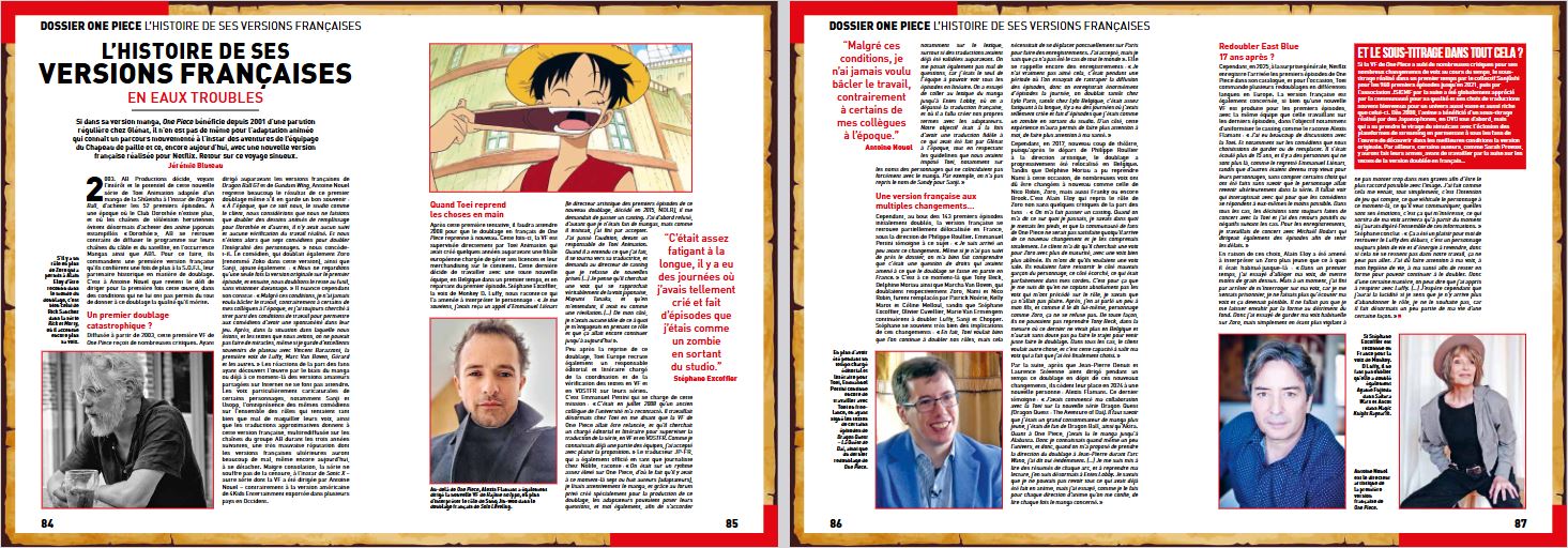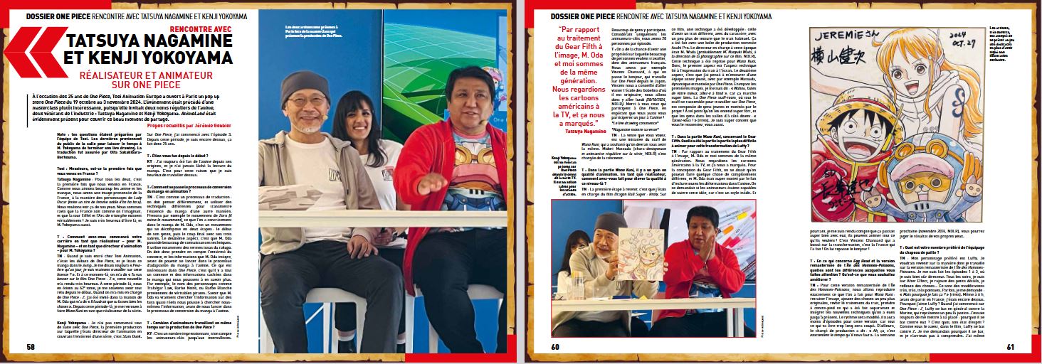 L’équipe d’AnimeLand revient évidemment sur la création et la prépublication de One Piece, la vie de son auteur, mais aussi sur l’histoire de la production de l’anime et ses innombrables produits dérivés. Encore une fois, notre rédaction, présente au Japon pour couvrir des expositions One Piece, a mis les bouchées doubles pour donner la parole à des acteurs importants de ces adaptations anime. Ainsi, dans ce numéro préfacé par Yoshihiro Ueda, réalisateur d’épisode sur One Piece, vous pourrez retrouver 34 pages d’interview avec :